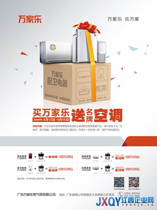 江西企業網訊 為感謝全國用戶的支持和信賴,4月15日至5月15日期間,萬家樂推出《買萬家樂廚衛電器 送名牌變頻空調》“五一”大型優惠活動。只要消費者選購指定產品套餐即可有名牌變頻空調、空氣凈化器兩件套或萬家樂3000元櫥柜代金券相送。