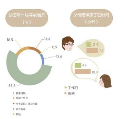 此外值得注意的是,盡管一有部分家庭認(rèn)識到了父母均等陪伴孩子的重要性,但“隱形爸爸”仍是普遍現(xiàn)象。調(diào)研顯示,55.8%的家庭中,日常陪伴孩子的都是母親。父親陪伴較多或父母陪伴一樣多的家庭僅占12.6%和16.5%。父親在工作日陪伴時間為2.9小時,在周末為7.7小時,遠(yuǎn)低于母親的4.6小時與10.9小時。