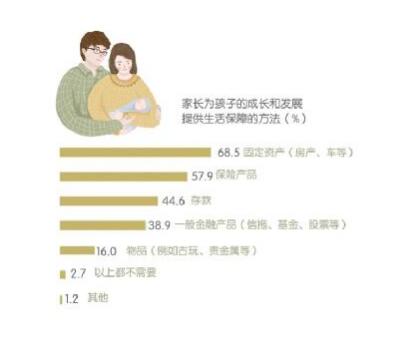 白皮書數(shù)據(jù)顯示,中國家長普遍認(rèn)為,即使自己不能一直陪伴在孩子身邊,也要給孩子留下“物質(zhì)陪伴”。在此方面,父母們最傾向于借助固定資產(chǎn)(68.5%)和保險產(chǎn)品(57.9%)來守護(hù)孩子的成長與發(fā)展。