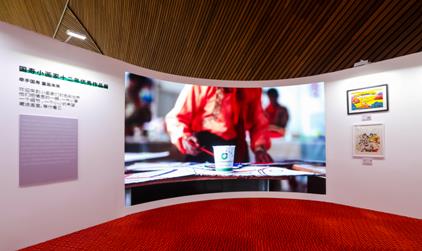 為了讓參觀者擁有更好的觀展藝術體驗,中國人壽壽險公司在展區(qū)內設置了許多互動裝置,如人屏互動電子屏、輪播屏幕、作品滾軸、LED大屏播放宣傳片等。公司還準備了小畫家畫作明信片,參觀嘉賓可自行蓋取印章作為展覽紀念,留下此次觀展的美好記憶。