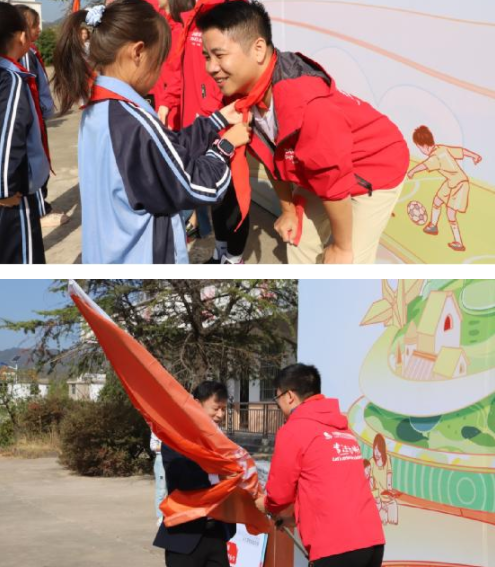 隨后,上饒市楓嶺頭平安希望小學的少先隊員為志愿者們系上了代表著紅旗一角的紅領巾,承載著同學們的熱情與期待。志愿者們從上饒市楓嶺頭中心小學小學陳朝欽書記手中接過了代表著期望與責任的志愿者旗幟,更是接過了一份責任,一份擔當。志愿者們在旗幟下莊嚴宣誓,許下奉行志愿者宗旨,踐行志愿者精神的諾言。