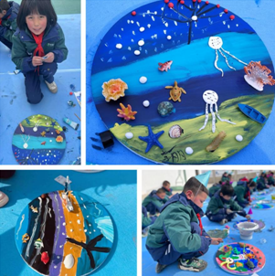 明媚的陽光下,小朋友們在操場席地而坐,拿著畫筆,用顏料涂出斑斕的海洋世界,用紙板制作千姿百態的海洋生物模型。