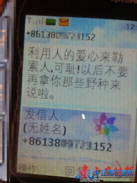 然而,圍繞小孩的撫養費問題,李梅與何某亮的矛盾并未就此了結。李梅向記者展示的一條短信顯示:“利用人的愛心來勒索人,可恥!以后不要再拿你那些野種來說啦。”經與何某亮所在單位有關人員核對,發信號碼為何某亮常用手機號。李梅說,“何某亮怎么能罵自己的孩子為野種呢?”