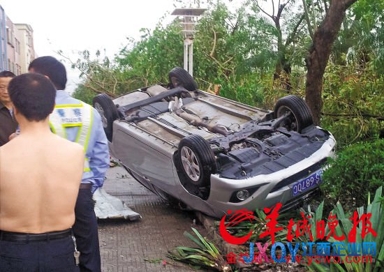 小汽車被狂風掀到路邊 羊城晚報記者 王俊偉 攝