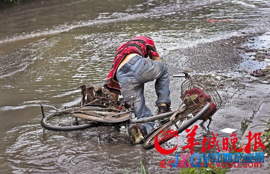 水淹過馬路,一不小心,人仰車翻掉水里 羊城晚報記者 陳秋明 攝