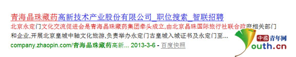 通過百度搜索,記者發現青海晶珠藏藥高新技術產業公司曾在智聯招聘上發布公司招聘信息,公司介紹中寫著:北京永定門文化交流促進會是青海晶珠藏藥集團牽頭成立。