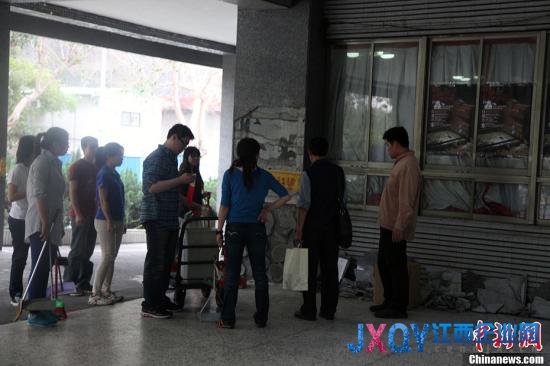 3月27日,南投地震發生截至當日下午5時30分,已造成1人死亡、86人受傷,各縣市中,以臺中市58人受傷最多。圖為臺中中興大學一群大學生在加緊清理墻上掉落的石板、碎片。該大學圖書館在1999年的9.21大地震中曾倒塌,今次地震發生后,臨時停課一天。中新社發董會峰攝