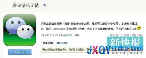 近日,有關微信收費的傳言在微博上喧囂塵上,微信官微可謂辟謠辟到手軟。圖片為新浪微博截圖