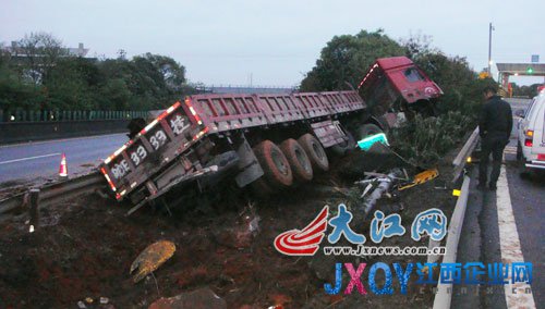 大江網(wǎng) 劉鋒、劉元統(tǒng)、記者歐陽遠(yuǎn)媛報道:4月7日凌晨4時許,福銀高速公路九江往南昌方向627KM處(艾城收費站附近),一輛滿載鋼材的大貨車撞開高速公路右側(cè)40多米的護(hù)欄后,沖上高速公路護(hù)坡上,側(cè)翻在護(hù)坡上,車輛嚴(yán)重受損,所幸事故未導(dǎo)致人員傷亡。