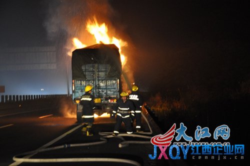 8日21時52分,泰和縣大廣高速往吉安方向一輛裝滿家具的貨車突然起火,司機在慌亂中撥打了報警電話。大隊接警后迅速出動兩輛消防車12名官兵趕赴現場救援。22時02分,救援人員到達現場后看到,貨車車身全部被火焰吞噬,大火正處于猛烈燃燒階段并逐漸向油箱蔓延,如不及時控制住火勢,溫度過高引起爆炸,后果不堪設想。
