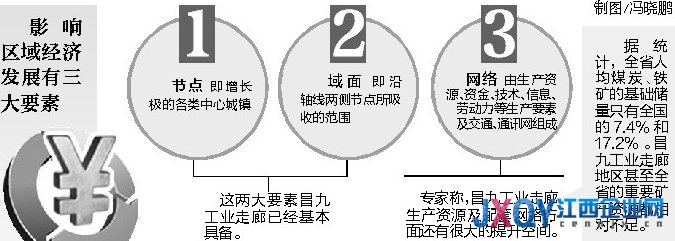 “影響區域經濟發展有三大要素:一是節點,即增長極的各類中心城鎮;二是域面,即沿軸線兩側節點所吸收的范圍;三是網絡,由生產資源、資金、技術、信息、勞動力等生產要素及交通、通訊網組成。”朱麗萌稱,昌九工業走廊,前面兩大要素都已經具備了,但在第三個方面,尤其是生產資源及配套網絡方面,還有很大的提升空間。記者從省統計局了解到,昌九工業走廊地區甚至全省的重要礦產資源相對不足,全省人均煤炭、鐵礦的基礎儲量只有全國的7.4%和17.2%,石油、煤炭、鐵礦石、銅礦石等重要礦產資源對外\(省外、境外、國外\)依存度已達到很高水平。