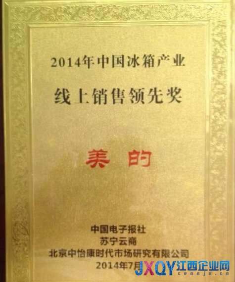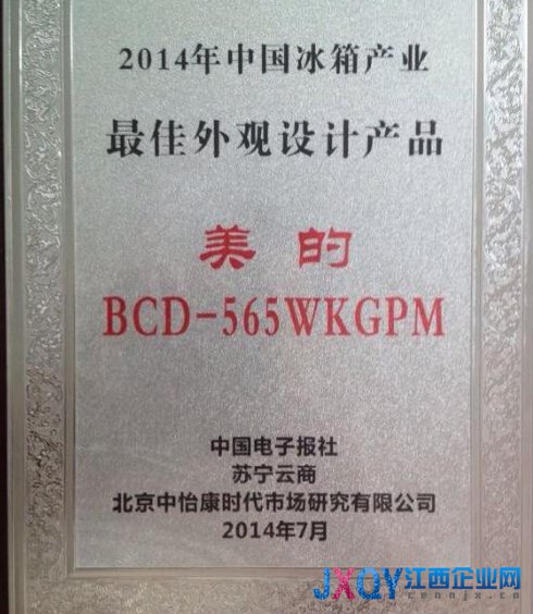 江西企業網訊 7月 2日下午,由中國電子報、蘇寧云商和北京中怡康時代市場研究有限公司聯合主辦,以“智無疆  鮮無界”為主題的2014年(第七屆)中國冰箱產業年會在京隆重舉行。會上,主辦機構和行業專家對2014年表現突出企業進行了頒獎。其中,美的冰箱榮獲了“2014年中國冰箱產業線上銷售領先獎”以及“2014年中國冰箱產業最佳外觀設計產品”兩項大獎,閃耀全場。