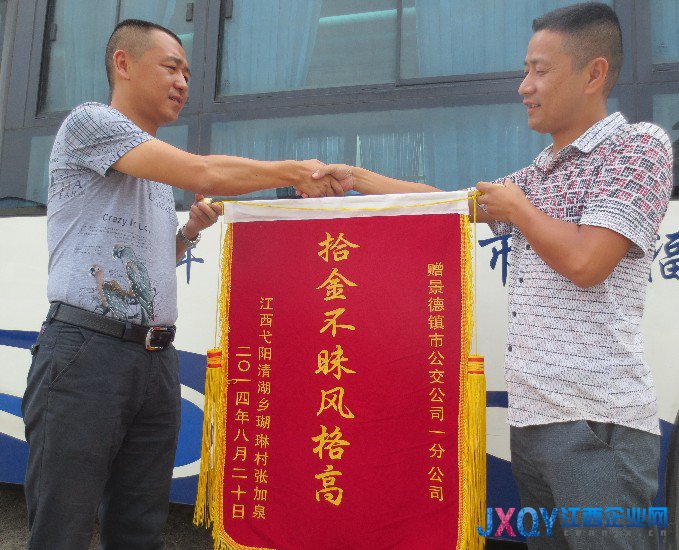 江西企業網訊 日前,江西弋陽的張先生和景德鎮市新華瓷廠退休職工夏師傅分別將繡有“拾金不昧 品格高尚”、“拾金不昧 學習楷模”的錦旗送到景德鎮市公交公司,贊揚該公司駕駛員拾金不昧的精神。