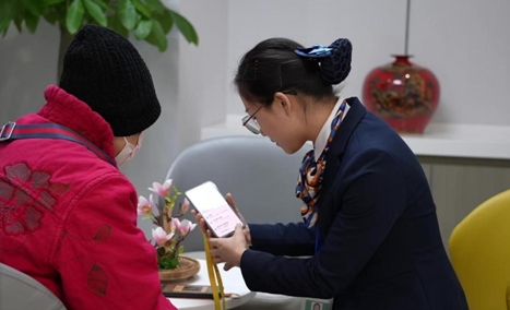 中國人壽壽險公司柜面工作人員幫老年客戶辦理業務