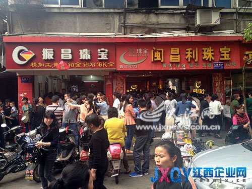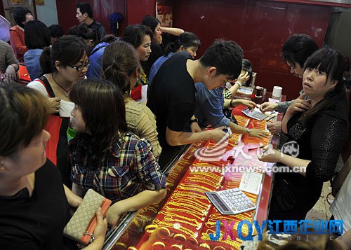 12日晚,國際金價幾乎出乎所有人意料的下跌78.75美元,至每盎司1482.75美元,跌幅為5.04%。15日,又受美國高盛集團下調黃金均價預期和中國經濟數據不及市場預期等一系列利空因素打壓,紐約商品交易所黃金期貨合約價格再次暴跌140.3美元,以百分比計算,黃金當日跌幅創1983年2月以來最高;以美元計算,黃金當日跌幅創1980年1月以來最高。影響到市場上,投資金條、飾品黃金等價格均有大幅度調整,這讓不少南昌市民坐不住了。“好不容易擠到柜臺上,‘搶’到了一條手鏈。”17日下午,市民小嚴也加入了“搶金”隊伍中,見證了南昌市民瘋狂買黃金的場面。