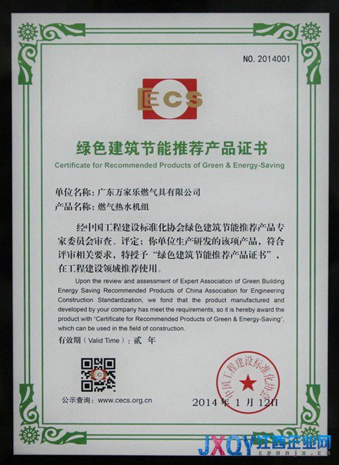 江西企業網訊 近日,由中國工程建設標準化協會(以下簡稱“中國建設標協”)與中房信研(北京)節能技術服務中心共同組織開展的《全國工程建設標準技術與產品應用目錄》(以下簡稱“《目錄》”)編制及工程建設產品評定推薦活動順利完成。萬家樂燃氣熱水機組憑借過硬的技術和產品質量,通過評審的相關要求,成功被中國建設標協編制收入《目錄》,并榮獲“綠色建筑節能推薦產品證書”。