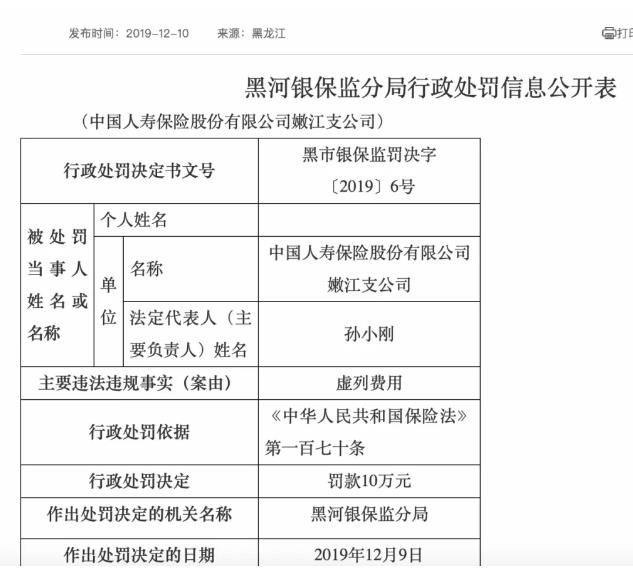 實際上,記者查閱公開資料發現,2019年12月9日,中國人壽嫩江支公司曾因虛列費用被黑河銀保監分局連開4張罰單,其中法定代表人孫小剛,與網友“兔寶寶1988Z”的舉報中提到的公司名和主要負責人名稱一致,該行政處罰顯示,孫小剛個人被罰款10萬元。