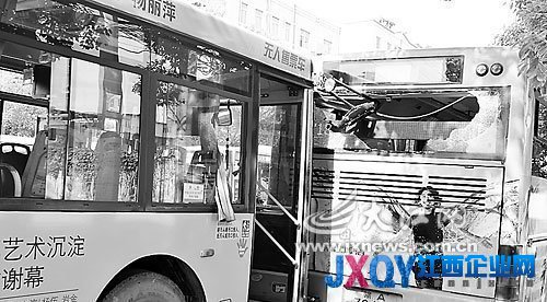 本報訊 記者李志強攝影報道:27日8時50分,南昌市南京東路與國安路交界處附近兩輛公交車(208路和旅游1線)發生相撞事故,造成玻璃窗碎落一地,所幸車上乘客并無傷亡。然而,乘客自行下車散去后,兩名當事司機很快也駕車駛離現場,遺留現場的一堆玻璃碎渣卻無人清理,留下安全隱患。