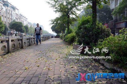 鐘女士住在萍鄉市蘇州街旁邊的一個小區。這條長約2公里的街道中間有一條河,河道兩旁栽種著近百株銀杏和其他樹種。前兩天,鐘女士沿著河畔散步時看到,部分銀杏樹的葉子黃了,而且一陣風吹過,樹上的葉子就會呼啦呼啦地飄落。只要一天不打掃,河畔兩旁的人行道就會被樹葉覆蓋。鐘女士很擔憂:“這種嚴重的落葉現象到底是什么原因,是環境不好,還是這些銀杏樹生病了?”