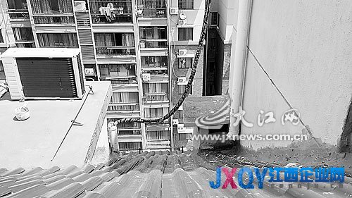 由于王女士家住頂樓,記者隨后來到該棟樓的頂部。記者觀察到,開發商沒有將落水管接到地上,而是將水直接排放到屋頂瓦片,再順著墻面流向地面。而隨著時間的日積月累,落水管出水口已經形成了一個不小的“淺水灣”。一旦雨水來時,不可避免地滲入墻體。