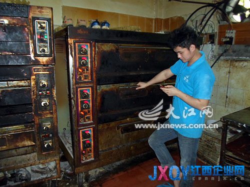 19日下午,記者在鳳凰花園東區的一排店面內找到了該廠,該廠大門緊閉,但陣陣糕點香味正通過排氣扇傳出。記者從店面外面的窗戶窟窿往里面望去,一名年輕小伙子正打著赤膊在烘烤房內忙活著。