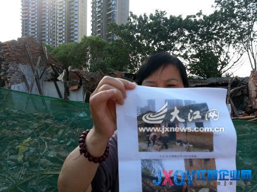 裘女士在廢墟前展示房屋被偷拆前的照片。本報記者劉濟海攝