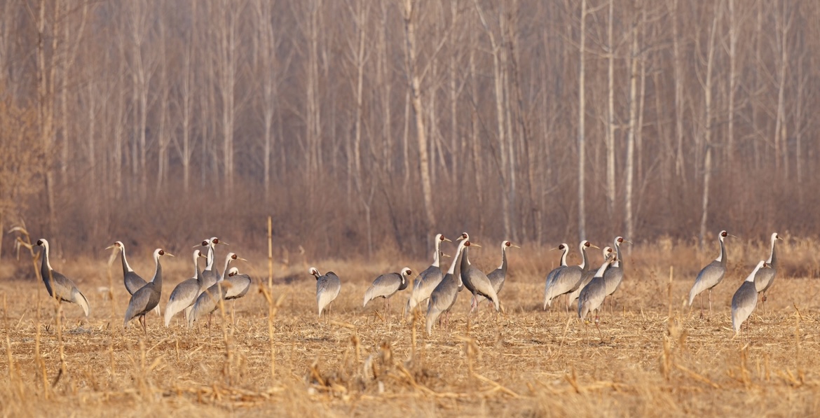 圖:國家一級保護動物白枕鶴正在北京密云近自然森林經營及鳥類棲息地優化項目地停歇覓食
