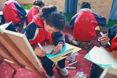 圖:美術課堂上,孩子們用嶄新的畫筆描繪藍天、綠草、雪山、牦牛